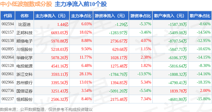 资金流向方面,中小低波(399663)指数成份股当日主力资金净流出合计1.84亿元,游资资金净流入合计3.75亿元,散户资金净流出合计1.91亿元。成份股资金流向详情见下表: