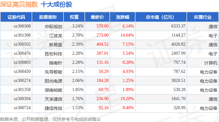 深证高贝(399662)指数十大成份股详情如下: