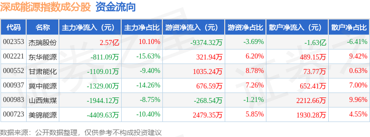 资金流向方面,深成能源(399680)指数成份股当日主力资金净流入合计1.61亿元,游资资金净流出合计5129.75万元,散户资金净流出合计1.09亿元。成份股资金流向详情见下表: