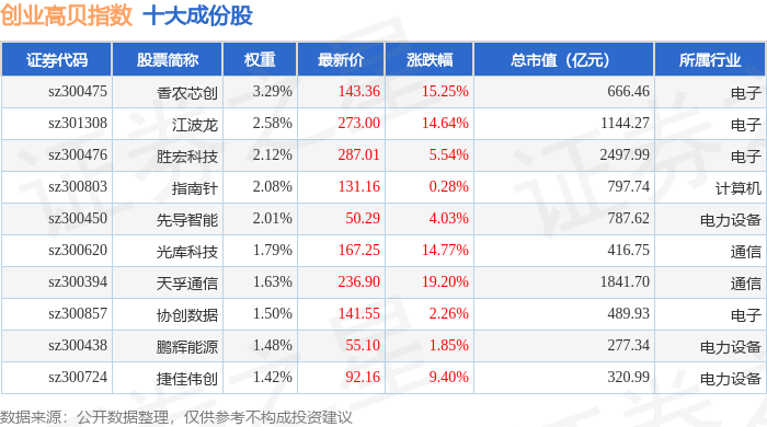 创业高贝(399694)指数十大成份股详情如下: