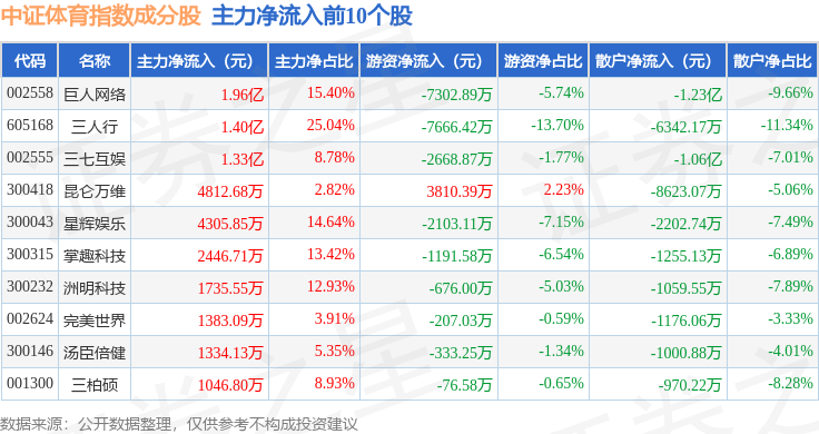 资金流向方面,中证体育(399804)指数成份股当日主力资金净流入合计4.34亿元,游资资金净流出合计1.71亿元,散户资金净流出合计2.62亿元。成份股资金流向详情见下表: