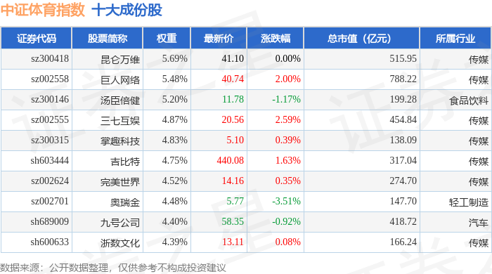 证券之星消息,12月8日,中证体育(399804)指数报收于1957.86点,涨0.44%,成交110.01亿元,换手率2.18%。当日该指数成份股中,上涨的有26家,三人行以10.0%的涨幅领涨,下跌的有13家,奥瑞金以3.51%的跌幅领跌。