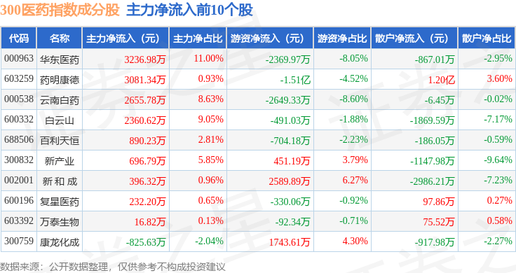 资金流向方面,300医药(399913)指数成份股当日主力资金净流出合计3.36亿元,游资资金净流出合计8718.02万元,散户资金净流入合计4.23亿元。成份股资金流向详情见下表: