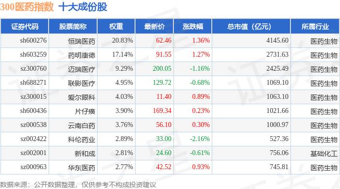 近10日内300医药(399913)指数成份股做了调整,剔除了1只股票。