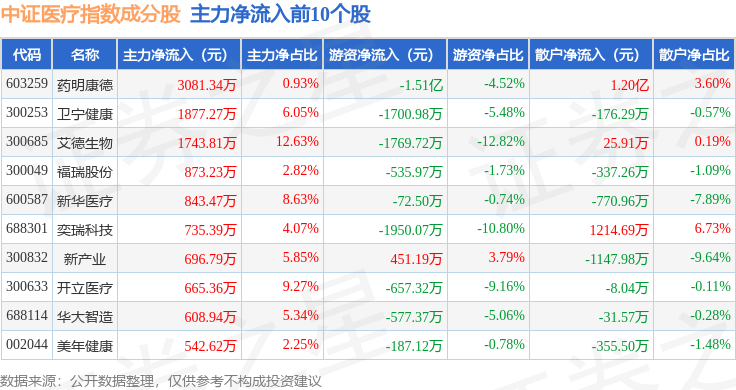 资金流向方面,中证医疗(399989)指数成份股当日主力资金净流出合计2.65亿元,游资资金净流出合计1.64亿元,散户资金净流入合计4.29亿元。成份股资金流向详情见下表: