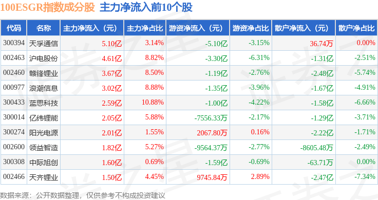 资金流向方面,100ESGR(470027)指数成份股当日主力资金净流入合计4272.49万元,游资资金净流出合计3.05亿元,散户资金净流入合计2.62亿元。成份股资金流向详情见下表: