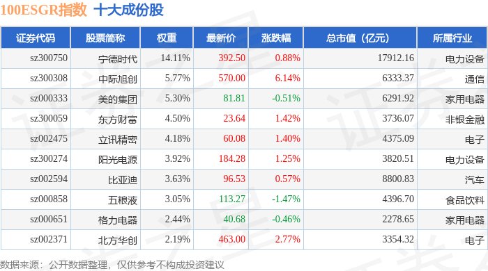 证券之星消息,12月8日,100ESGR(470027)指数报收于8307.17点,涨1.21%,成交1854.83亿元,换手率1.43%。当日该指数成份股中,上涨的有39家,天孚通信以19.2%的涨幅领涨,下跌的有40家,中信特钢以2.57%的跌幅领跌。