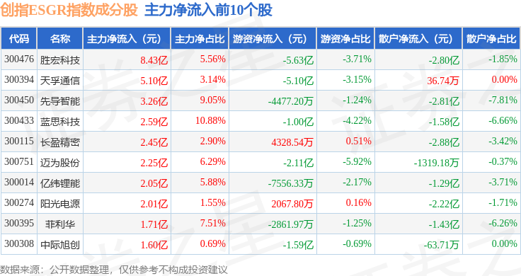 资金流向方面,创指ESGR(470028)指数成份股当日主力资金净流入合计29.89亿元,游资资金净流出合计11.18亿元,散户资金净流出合计18.71亿元。成份股资金流向详情见下表: