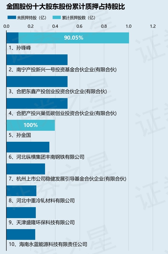 截止本公告日,股东孙锋峰已累计质押股份9047.34万股,占其持股总数的90.05%,股东孙金国已累计质押股份3982.48万股,占其持股总数的100.0%。本次质押后金固股份十大股东的累计质押股份占持股比例(占持股比例的计算以公司最新一期财务报表公布的十大股东的持股总数为基准)见下图: