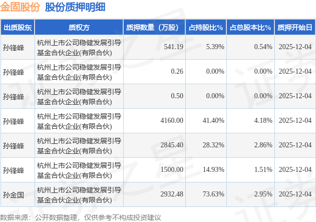 证券之星消息,金固股份(002488)12月8日公开信息显示,股东孙锋峰、孙金国向杭州上市公司稳健发展引导基金合伙企业(有限合伙)合计质押1.2亿股,占总股本12.04%。质押详情见下表: