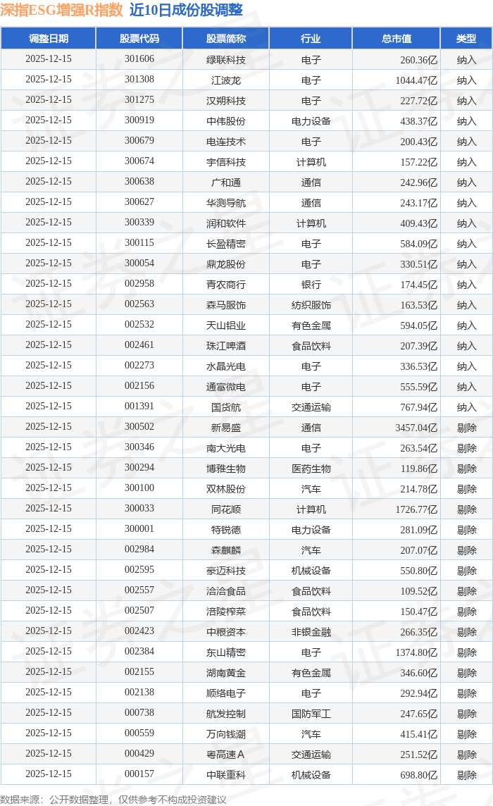 近10日内深指ESG增强R(470032)指数成份股做了调整,新纳入了18只股票,剔除了18只股票。