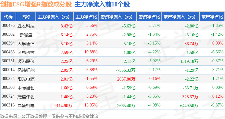 资金流向方面,创指ESG增强R(470034)指数成份股当日主力资金净流入合计24.53亿元,游资资金净流出合计16.4亿元,散户资金净流出合计8.13亿元。成份股资金流向详情见下表: