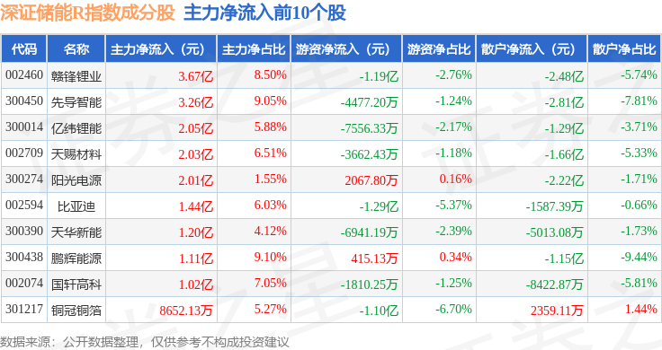 资金流向方面,深证储能R(470036)指数成份股当日主力资金净流入合计17.48亿元,游资资金净流出合计5.31亿元,散户资金净流出合计12.17亿元。成份股资金流向详情见下表: