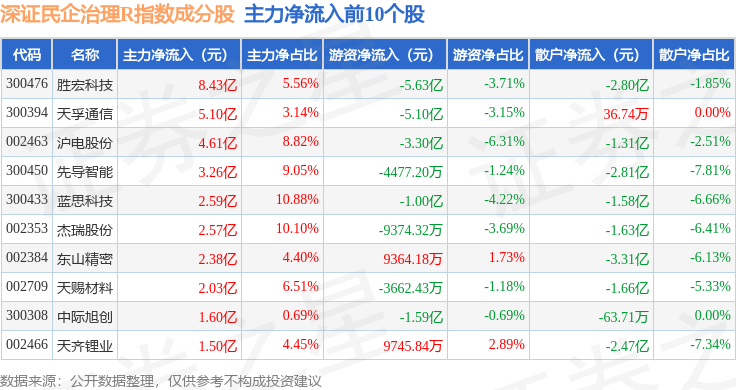 资金流向方面,深证民企治理R(470058)指数成份股当日主力资金净流入合计33.46亿元,游资资金净流出合计15.49亿元,散户资金净流出合计17.97亿元。成份股资金流向详情见下表: