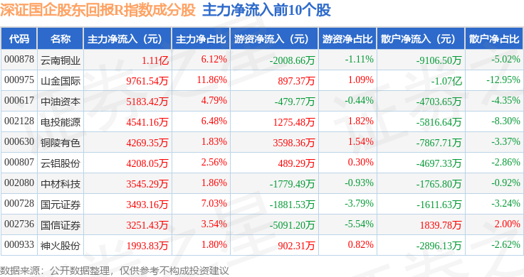 资金流向方面,深证国企股东回报R(470064)指数成份股当日主力资金净流出合计14.72亿元,游资资金净流入合计7.2亿元,散户资金净流入合计7.53亿元。成份股资金流向详情见下表: