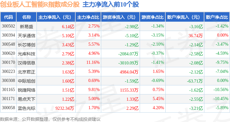 资金流向方面,创业板人工智能R(470070)指数成份股当日主力资金净流入合计24.68亿元,游资资金净流出合计7.95亿元,散户资金净流出合计16.73亿元。成份股资金流向详情见下表: