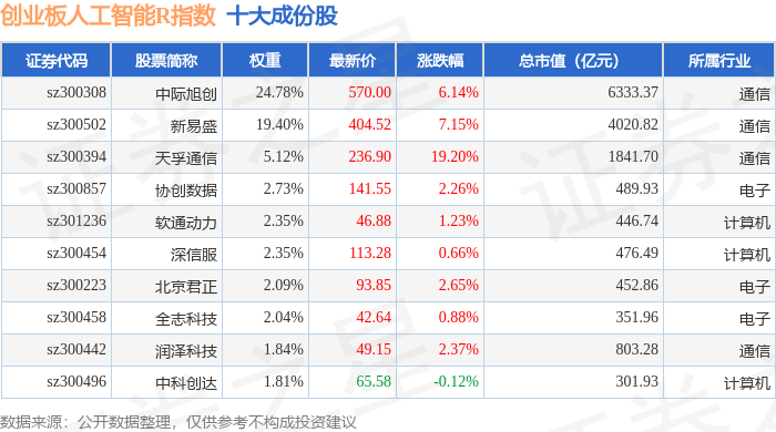创业板人工智能R(470070)指数十大成份股详情如下: