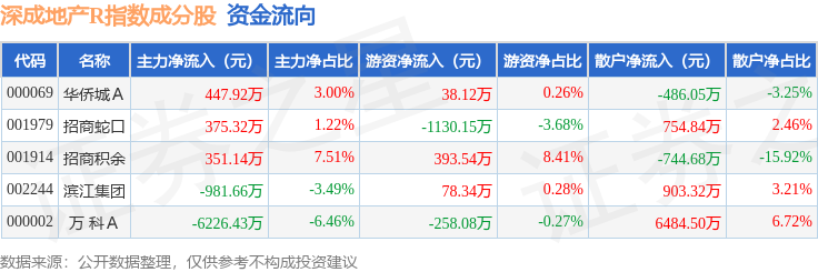 资金流向方面,深成地产R(471001)指数成份股当日主力资金净流出合计6033.71万元,游资资金净流出合计878.22万元,散户资金净流入合计6911.93万元。成份股资金流向详情见下表: