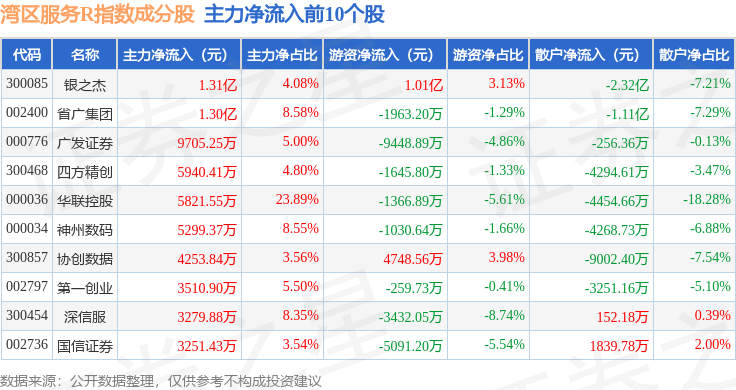 资金流向方面,湾区服务R(480011)指数成份股当日主力资金净流入合计3.59亿元,游资资金净流出合计2.07亿元,散户资金净流出合计1.52亿元。成份股资金流向详情见下表: