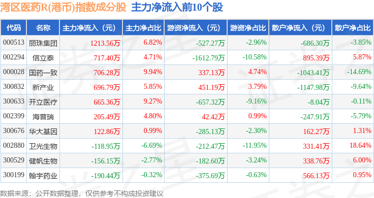 资金流向方面,湾区医药R(港币)(480014)指数成份股当日主力资金净流出合计4.08亿元,游资资金净流入合计473.34万元,散户资金净流入合计4.03亿元。成份股资金流向详情见下表: