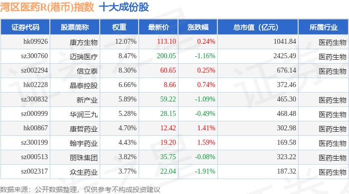 湾区医药R(港币)(480014)指数十大成份股详情如下: