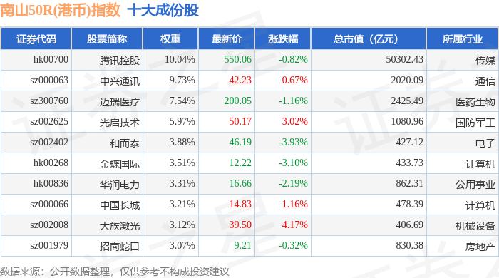 南山50R(港币)(480024)指数十大成份股详情如下: