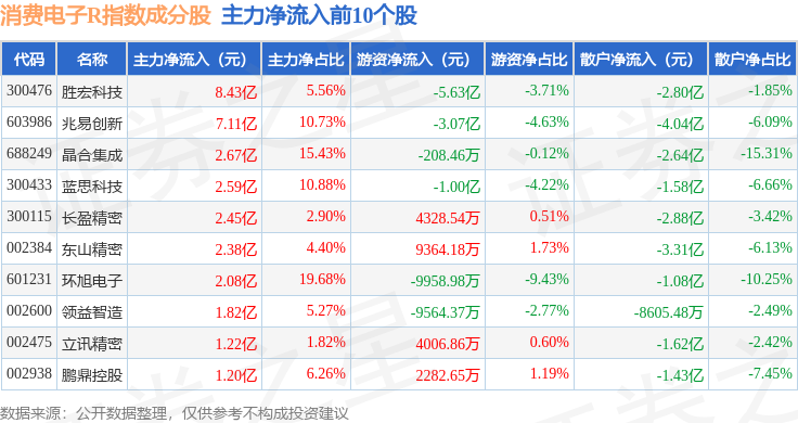 资金流向方面,消费电子R(480030)指数成份股当日主力资金净流入合计9.46亿元,游资资金净流出合计3.93亿元,散户资金净流出合计5.53亿元。成份股资金流向详情见下表: