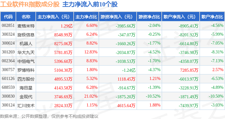 资金流向方面,工业软件R(480034)指数成份股当日主力资金净流出合计3148.17万元,游资资金净流入合计153.78万元,散户资金净流入合计2994.38万元。成份股资金流向详情见下表: