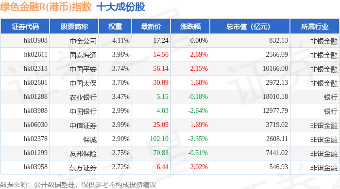 绿色金融R(港币)(480053)指数十大成份股详情如下: