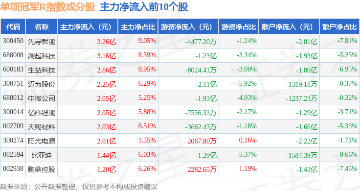 资金流向方面,单项冠军R(480150)指数成份股当日主力资金净流入合计8.86亿元,游资资金净流出合计4.85亿元,散户资金净流出合计4.01亿元。成份股资金流向详情见下表: