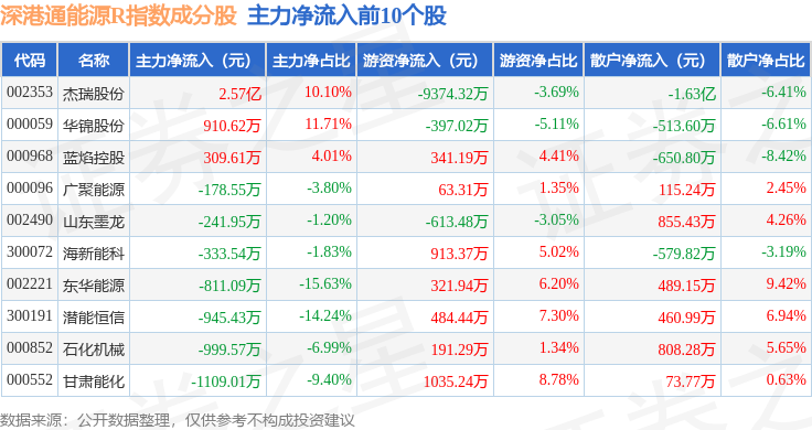 资金流向方面,深港通能源R(483013)指数成份股当日主力资金净流入合计1.46亿元,游资资金净流出合计4146.64万元,散户资金净流出合计1.04亿元。成份股资金流向详情见下表: