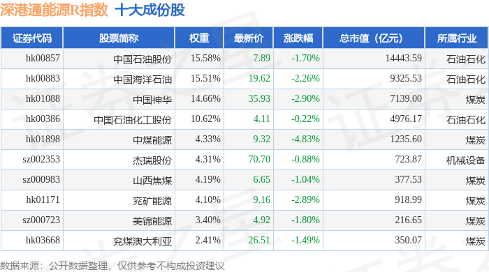 证券之星消息,12月8日,深港通能源R(483013)指数报收于12630.53点,跌1.53%,成交72.9亿元,换手率0.43%。当日该指数成份股中,上涨的有6家,MONGOL MINING以1.97%的涨幅领涨,下跌的有25家,力量发展以5.66%的跌幅领跌。
