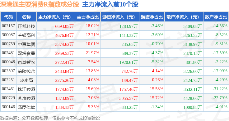 资金流向方面,深港通主要消费R(483021)指数成份股当日主力资金净流出合计13.15亿元,游资资金净流入合计6.33亿元,散户资金净流入合计6.82亿元。成份股资金流向详情见下表: