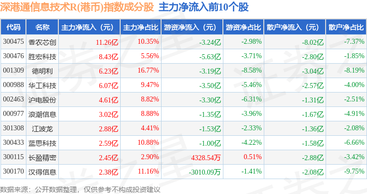 资金流向方面,深港通信息技术R(港币)(483028)指数成份股当日主力资金净流入合计47.76亿元,游资资金净流出合计22.26亿元,散户资金净流出合计25.5亿元。成份股资金流向详情见下表: