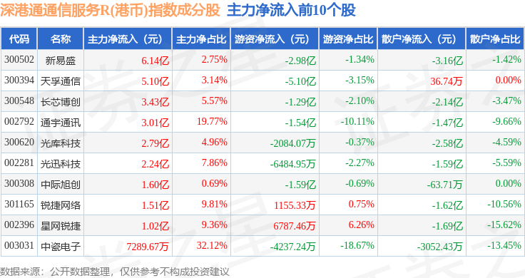 资金流向方面,深港通通信服务R(港币)(483034)指数成份股当日主力资金净流入合计15.09亿元,游资资金净流出合计16.3亿元,散户资金净流入合计1.21亿元。成份股资金流向详情见下表: