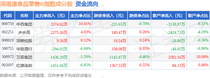 资金流向方面,深港通食品零售R(483037)指数成份股当日主力资金净流入合计2477.46万元,游资资金净流入合计492.8万元,散户资金净流出合计2970.26万元。成份股资金流向详情见下表: