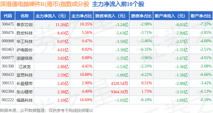 资金流向方面,深港通电脑硬件R(港币)(483044)指数成份股当日主力资金净流入合计29.98亿元,游资资金净流出合计18.61亿元,散户资金净流出合计11.37亿元。成份股资金流向详情见下表: