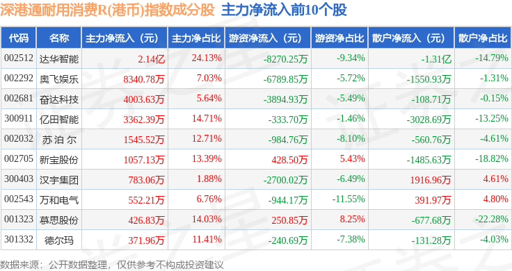资金流向方面,深港通耐用消费R(港币)(483050)指数成份股当日主力资金净流出合计1.99亿元,游资资金净流出合计444.16万元,散户资金净流入合计2.04亿元。成份股资金流向详情见下表: