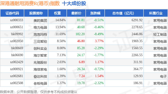 深港通耐用消费R(港币)(483050)指数十大成份股详情如下: