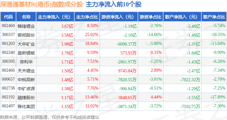 资金流向方面,深港通基材R(港币)(483062)指数成份股当日主力资金净流入合计12.23亿元,游资资金净流入合计7416.56万元,散户资金净流出合计12.97亿元。成份股资金流向详情见下表: