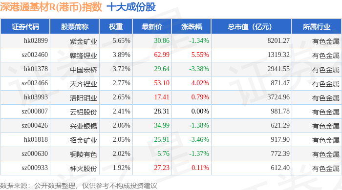 深港通基材R(港币)(483062)指数十大成份股详情如下: