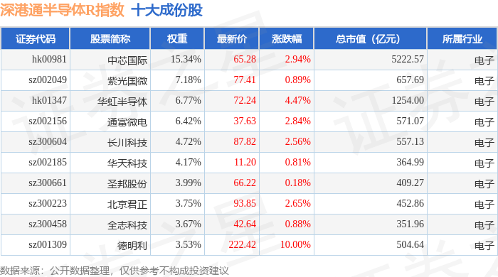 证券之星消息,12月8日,深港通半导体R(483067)指数报收于14962.92点,涨2.61%,成交417.11亿元,换手率3.4%。当日该指数成份股中,上涨的有35家,赛微电子以11.35%的涨幅领涨,下跌的有4家,航宇微以2.63%的跌幅领跌。