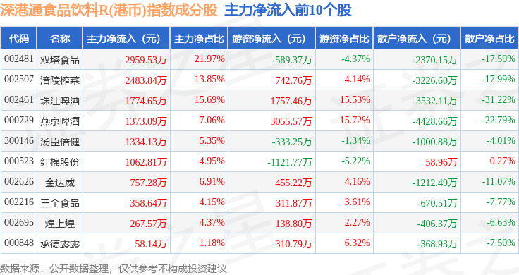 资金流向方面,深港通食品饮料R(港币)(483066)指数成份股当日主力资金净流出合计12.53亿元,游资资金净流入合计4.93亿元,散户资金净流入合计7.6亿元。成份股资金流向详情见下表: