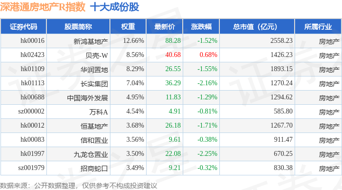 证券之星消息,12月8日,深港通房地产R(483071)指数报收于3372.85点,跌0.84%,成交105.53亿元,换手率0.88%。当日该指数成份股中,上涨的有20家,中国武夷以5.4%的涨幅领涨,下跌的有50家,碧桂园以4.81%的跌幅领跌。