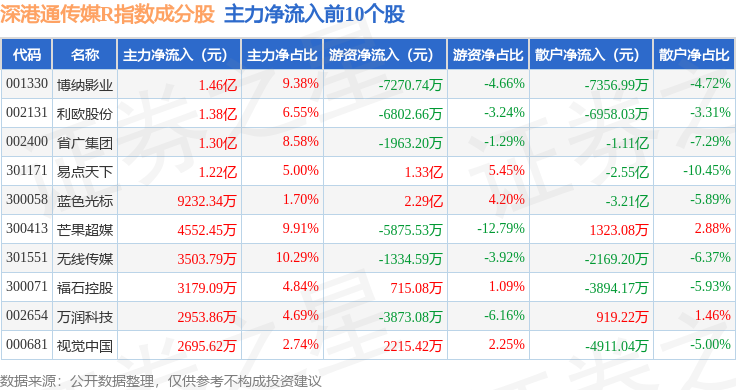 资金流向方面,深港通传媒R(483075)指数成份股当日主力资金净流入合计4.36亿元,游资资金净流入合计1.72亿元,散户资金净流出合计6.08亿元。成份股资金流向详情见下表: