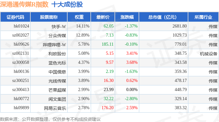 深港通传媒R(483075)指数十大成份股详情如下: