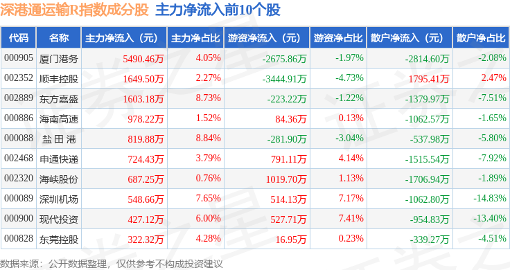 资金流向方面,深港通运输R(483077)指数成份股当日主力资金净流出合计290.54万元,游资资金净流入合计6118.95万元,散户资金净流出合计5828.42万元。成份股资金流向详情见下表: