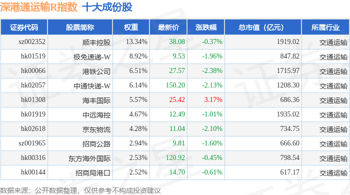 深港通运输R(483077)指数十大成份股详情如下: