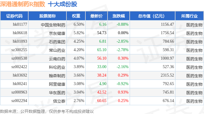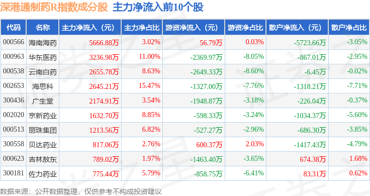 资金流向方面,深港通制药R(483079)指数成份股当日主力资金净流出合计14.42亿元,游资资金净流入合计3.08亿元,散户资金净流入合计11.34亿元。成份股资金流向详情见下表: