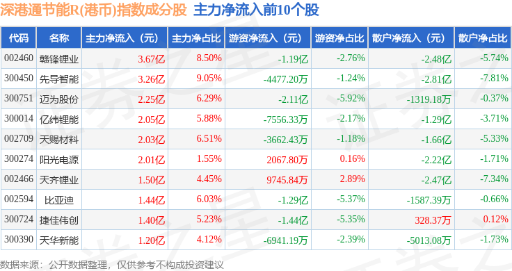 资金流向方面,深港通节能R(港币)(483086)指数成份股当日主力资金净流入合计23.09亿元,游资资金净流出合计7.67亿元,散户资金净流出合计15.41亿元。成份股资金流向详情见下表: